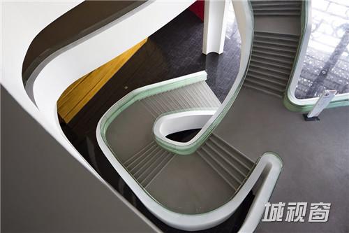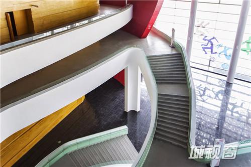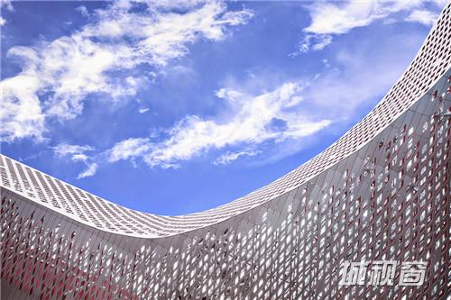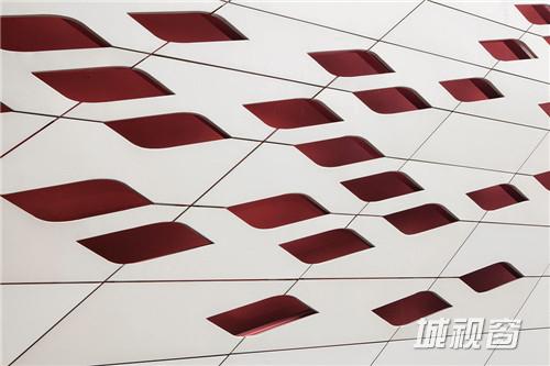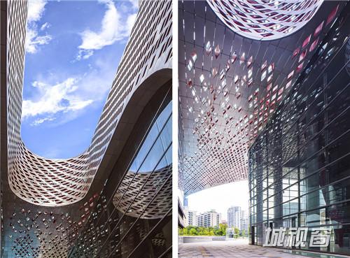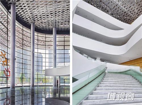 文化中心的所有楼层被大型休息厅连为一体,休息厅以蓝色与红色的墙壁与中国戏剧脸谱图像欢迎到访的客人。不同楼层之间用白色带状造 型的走道连接。整体建筑中金属制造的,由数以万计的独立铝片组成流线型屋顶尤为突出。