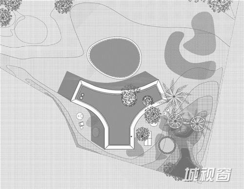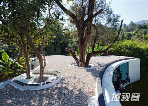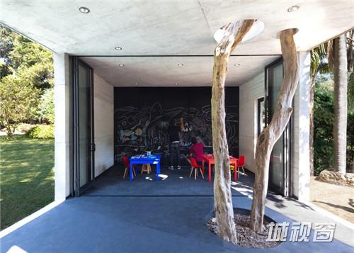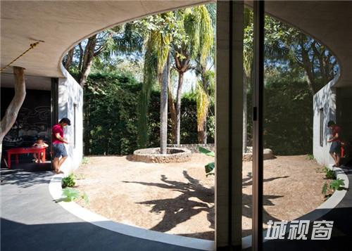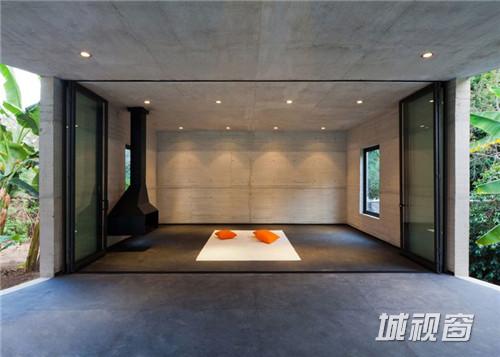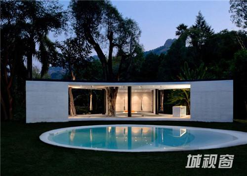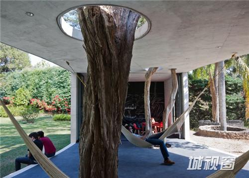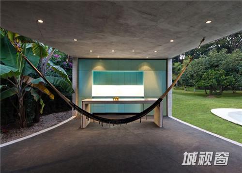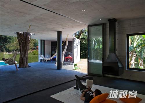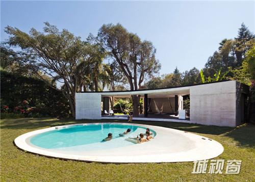 当游客来到墨西哥的Tepoztlan时不妨到这里的这座由Cadaval & Sola-Morales设计的混凝土小会客屋住上几夜。Cadaval & Sola-Morales设计的这pavilion是该城镇一系列度假小屋中的第一座,位于墨西哥城的郊区Tepoztlan山的边缘。该建筑由三道弧线划出外轮廓,自然地形成了三个半围合式的院落。院落里分别点缀了大小泳池及休闲设施。当建筑三个立面上的落地玻璃窗打开时,建筑就变成了一个贯通的公共空间。客人可以坐在或躺在中央的吊床上交谈或休息,甚至连大树也“参与”到这个空间中,只不过它个子太高冲破了屋顶……其他三个房间分别是起居室,儿童活动空间与卫生间,分别被安排在建筑三个角部。你会发现,怎么没有卧室?你看中间的公共空间,不是有那么多的吊床吗!~