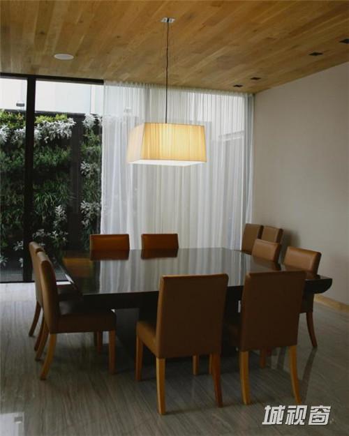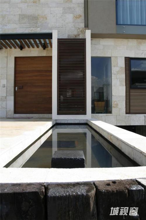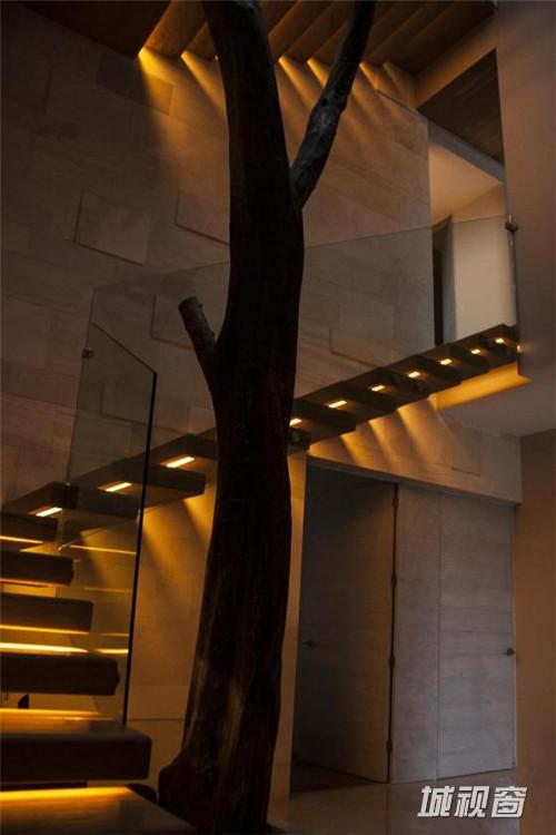 住宅楼拥有不同的和形成鲜明对比的体量,它们的外墙会吸引人们的注意力,有些外墙是木格子制成的,其他的是天然石修建的。外墙的粉刷使用的是纯色,但是墙上的窗户则显得很活泼,所有这些设计都在邀请人们进入室内并赞美整个工程。一旦进入室内,你会看见一棵吸引人的树和一个看似漂浮的楼梯。室内的光线来自于天窗,这个天窗创造了一个明亮而又热情的气氛。接着,是一个一分为二的社会区域,其中一个更加亲近和隐私,空间里包括家庭休息室和一个通往后院的很好的阳台。另一个部分包括餐厅、起居室和一个吧台,吧台周围是一个横向的天井,天井中有一个垂直的花园和后院,创造了一个自然和放松的环境。还有一点必须提一下,室内所有的区域都可以通过帷幔的使用进行划分,这样的设计是为了保护居住者的隐私。服务通道也在这一楼,通道连接着一个洗衣间,洗衣间连接着宽敞的厨房,厨房里的光线非常充足。厨房讲究的的设计可供居住者进行烹调并得到美味的食物。