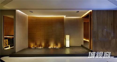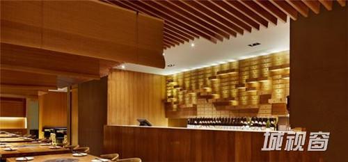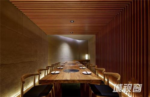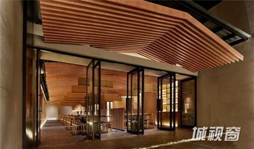 作为餐饮公共空间, 让客人穿过这么低矮的房檐进出包房, 设计这个高度被甲方投诉我们毫无常识可言,这个高度伸手都能触到房顶了。房檐设计这么矮,意在弱化墙面,强调错落的三角形房顶, 墙壁消失于房檐的阴影下,凸显了在都市建筑丛林中的小小山林。