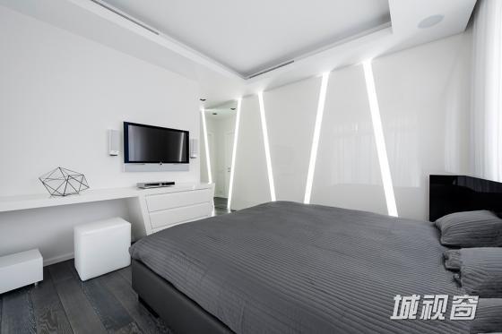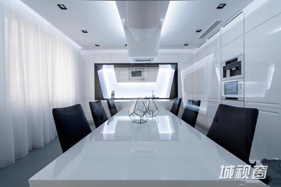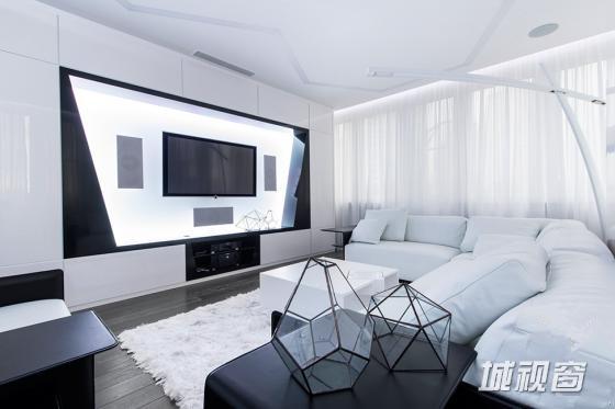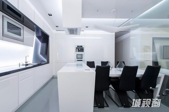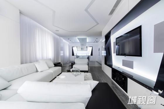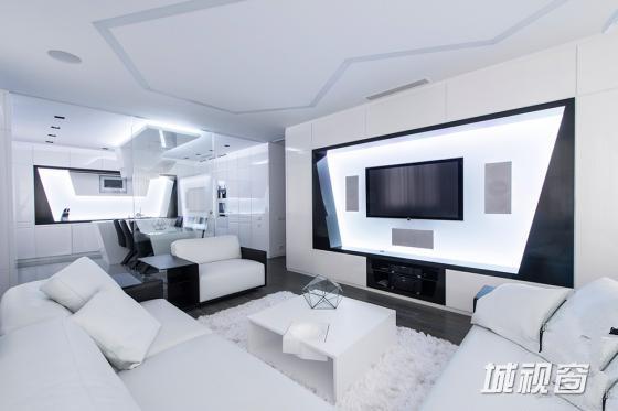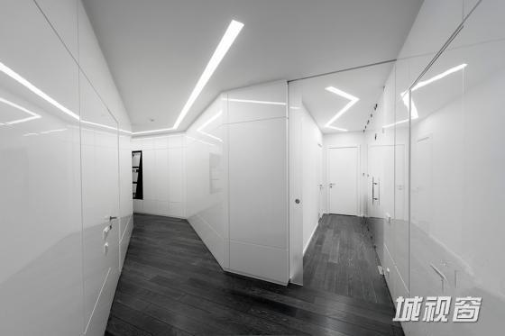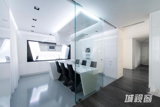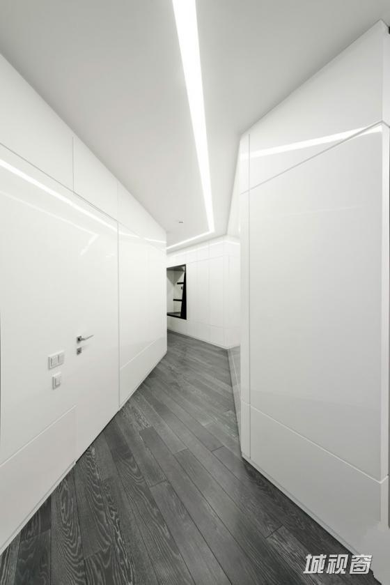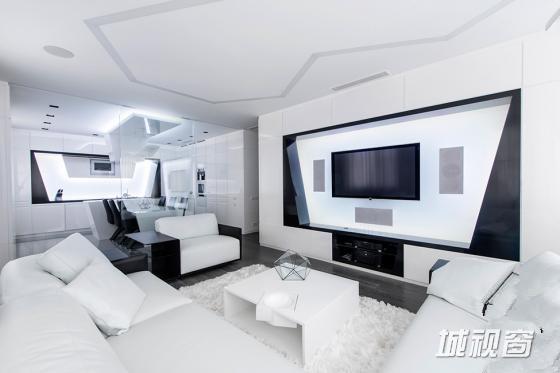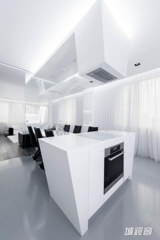 俄罗斯黑白色“冒险计划”未来派公寓,客厅和厨房利用玻璃墙作为空间界定,开放式的格局规划,让各空间巧妙的被串起,自在顺畅的动线规划。俄罗斯黑白色未来派公寓是由设计公司Geometrix在莫斯科打造了一间具有超强未来感的Axioma公寓,在这 130 平方平米的公寓里完成黑白装饰的冒险计划。大家对于 Axioma 的印象,大都是清新简单,单色系,避免不必要的装饰细节,但具有强烈的设计感。当你打开公寓大门,看见内部装饰的第一个印象就是高科技充满未来感,具有反射效果的白色墙面,建构出简洁有力的建筑语言,在墙面的背后则是隐藏着许多储物柜和橱柜,提供大量的收纳空间。客厅和厨房利用玻璃墙作为空间界定,开放式的格局规划,让各空间巧妙的被串起,自在顺畅的动线规划。以几何造型为设计概念延伸,特殊线条蔓延在天花板上,让充满现代感的灯具更加时尚。
