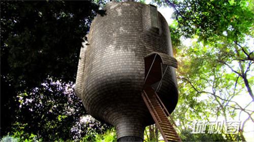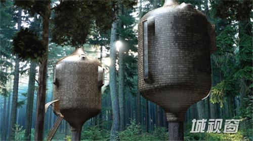 这是英国设计师安东尼(Antony Gibbon)设计的树屋,其设计理念是让他的树屋看上去与树干本身融为一体,似乎它就是树木本身的一部分。安东尼在设计他的树屋作品的时候,不仅仅在外观上考虑了与自然环境的匹配性,而且采用了一组支撑物来固定树屋,从而不影响树木的正常生长。