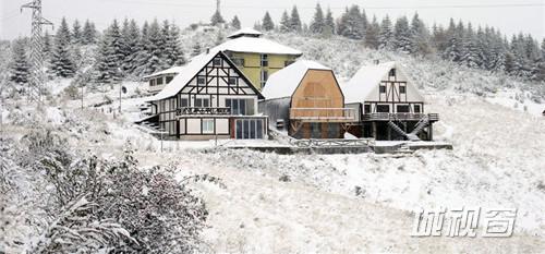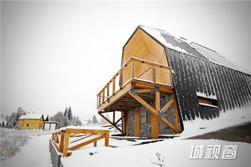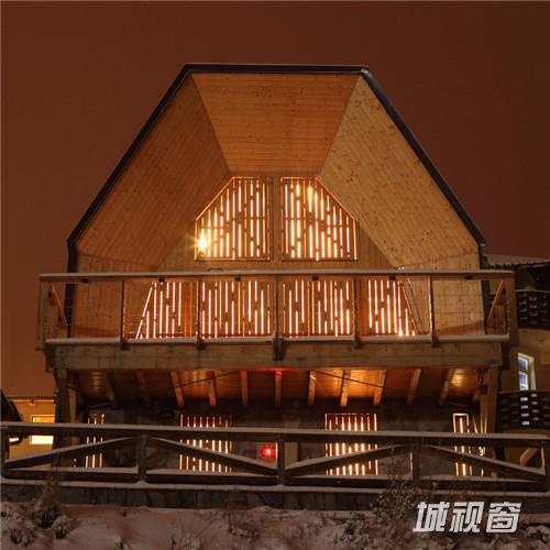 该建筑被分为两个相同的镜像部分,分属于两个将三层竖向分开的独立单元。一个巨大的墙体被安置在室内的中央部分,以保证墙体两侧木结构的稳定性。该方案另一个突出的特点是其作为前平台的公共阳台,该平台被安置在斜坡上空两个超出常规尺寸的悬臂梁上。