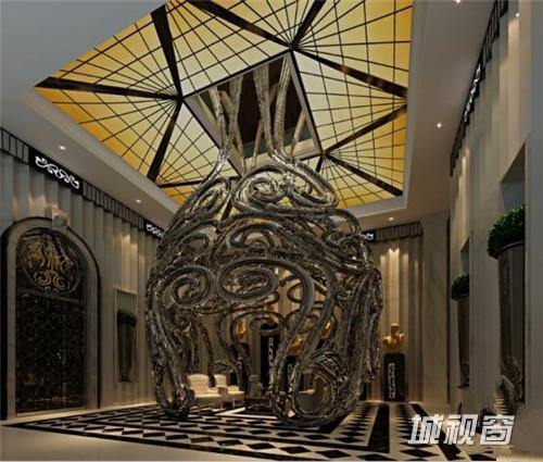 重庆贵族领地“黑灰白”环球5号会所,大堂天花也是本案的亮点之一,借鉴佛教使用的塔香造型,进行演变,以现代的风格进行诠释,使整个大堂空间既富丽堂皇又不失温馨浪漫。重庆贵族领地“黑灰白”环球5号会所采用平面与立体构成,疏与密以及黑白灰色调的完美结合,恰到好处的贯穿到空间的每个角落,犹如踏入奢华气派,金碧辉煌的贵族领地。本案休息区运用凯尔特的设计手法连接2—3层,令人震撼,则成整个会所的点睛之笔,让整个空间现代而不失趣味。大堂天花也是本案的亮点之一,借鉴佛教使用的塔香造型,进行演变,以现代的风格进行诠释,使整个大堂空间既富丽堂皇又不失温馨浪漫。