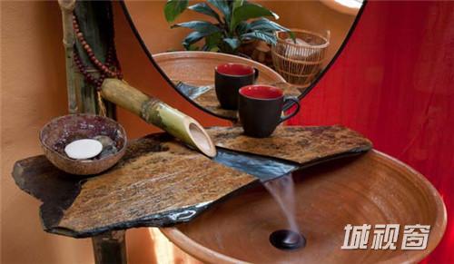 17) 浴室的水槽是用天然竹子做成。