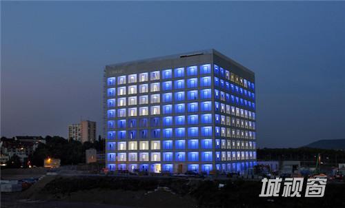 图书馆外部采用浅灰色的清水混凝土和磨砂玻璃材料的双层结构,图书馆平面呈正方形,夜晚的灯光效果为蓝色,外观看上去就像一个巨大而复杂的两种颜色的魔方。