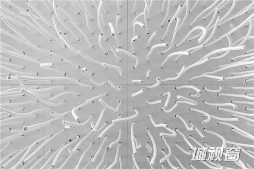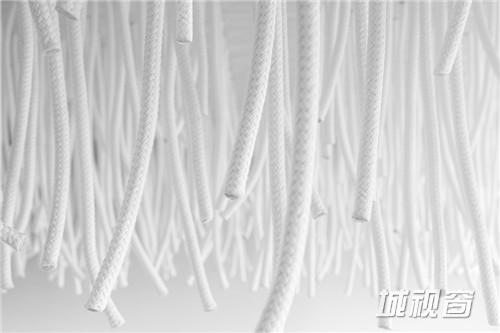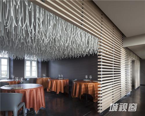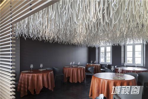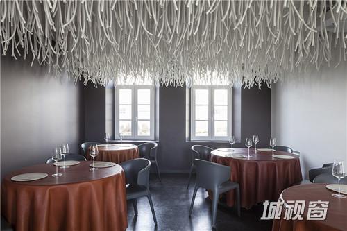 米其林二星餐厅L'Air du Temps的室内装潢以白色涤纶绳为主要材料,打造出一个抽象的“藤本植物”美学场景,体现了该餐厅厨师San的自然料理精神,创造出室内环境中独特的氛围,同时天花板上的涤纶绳能有效吸音。