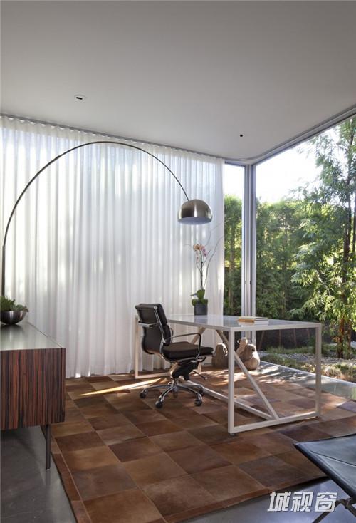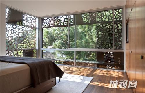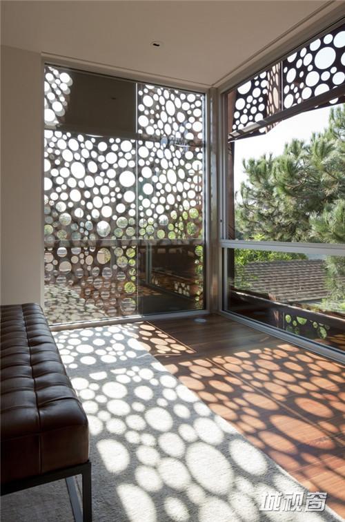 密集的项目元素,如车库以及与之相邻的储藏室和楼梯聚集在一起,朝向住宅的前面,支撑了上面的一个较轻的、有机组合在一起的卧室和浴室空间。在材质选用上多次使用了类似手法。低层的灰泥和混凝土支撑了上面较轻的结构和材质,例如木材、玻璃和穿孔的高强金属板。