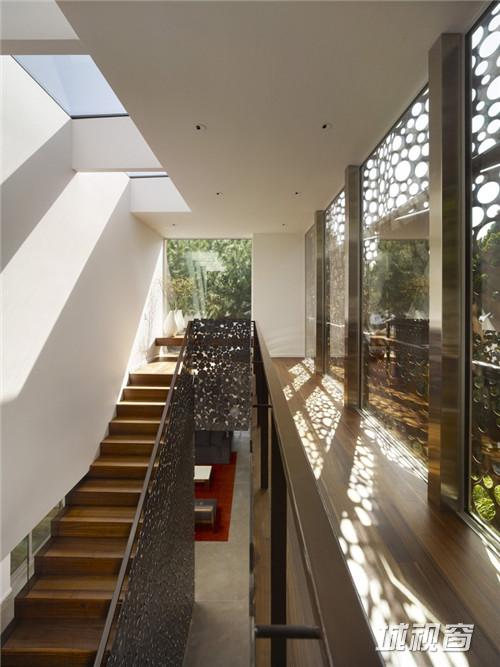 由于甲方不想移走该树,所以住宅规划设计围绕着场地中树木位置展开,虽然树木靠近场地后方,但无形中成为了项目的中心。这种结构形式将住宅的生活面积最大化,同时把对树木的影响降到最小。事实上,住宅的设计很简单,如果不加处理,就像放在那儿的许多泥灰盒子似的。通过探索外部幕墙的形式,提供了符合甲方品味和性格的动态形式,打造出建筑雕塑般的品质。