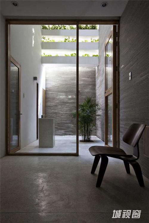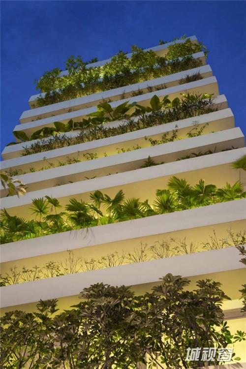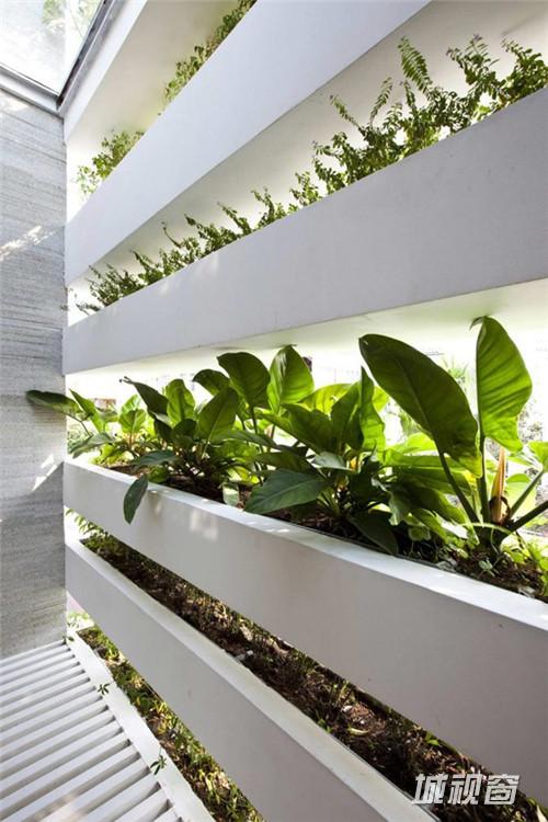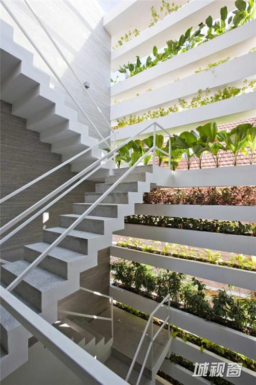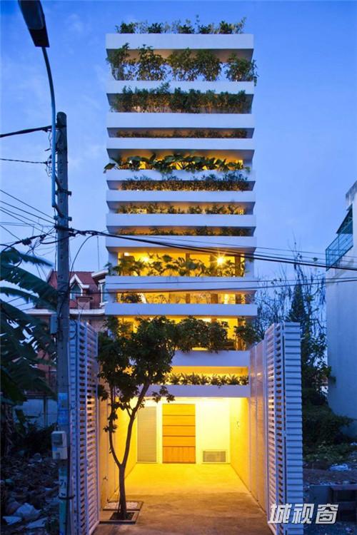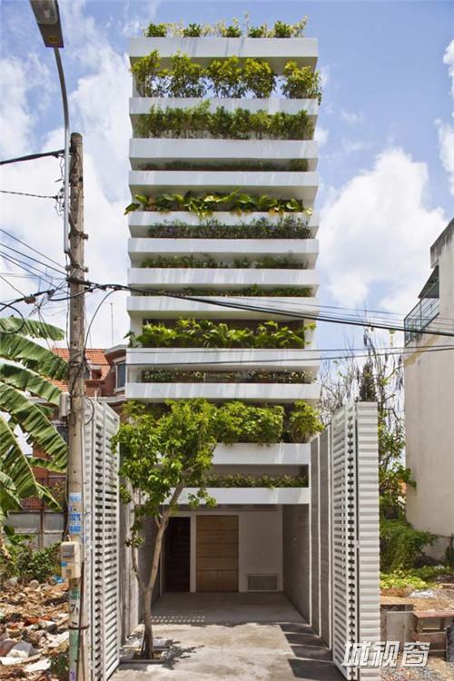 Vo Trong Nghia Co., ltd 设计了一座位于越南胡志明市的现代住宅,住宅的主人是一对30岁的夫妇和他们的妈妈。住宅呈筒形,宽4米高20米。住宅名为“Stacking Green”,最显著的特征是立面上层层堆积的露台以及上面摆放的大量绿色植物盆景。建筑的绿墙将污染与噪声隔绝在外,将室内的空气净化,阳光穿过绿墙在室内产生斑驳的光影,让人感觉仿佛置身雨林。