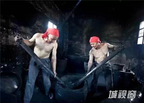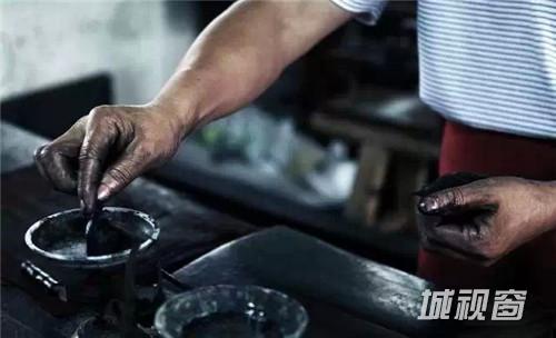 把烟和胶还有一些中草药混合在一起搅拌均匀后,放到铁臼里面进行捣研、揉搓,经过一定数量的捶打之后,便制成了初制的墨。