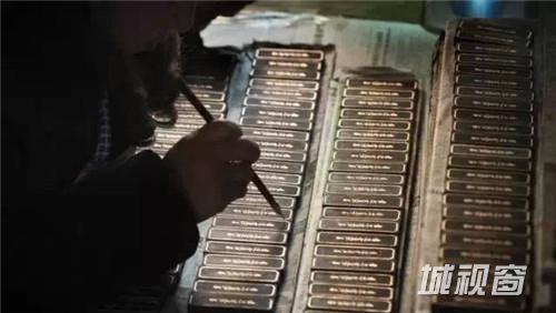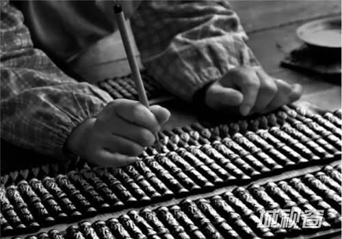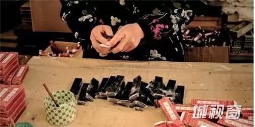 这个环节叫描金,晾干后的墨锭在出厂前,工人会按照墨锭上的图案和字,用颜料进行描画、填彩,以增加墨锭外观的美感。描金是个细致的活,需要很大的耐心,所以这个环节基本全是女工来完成。