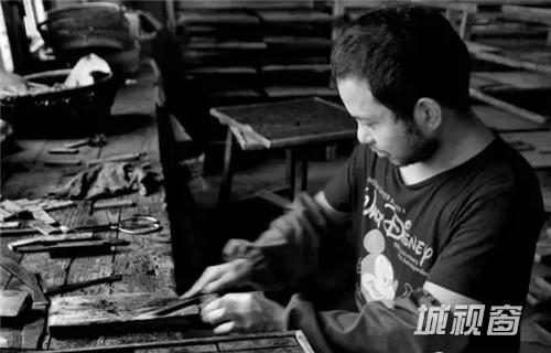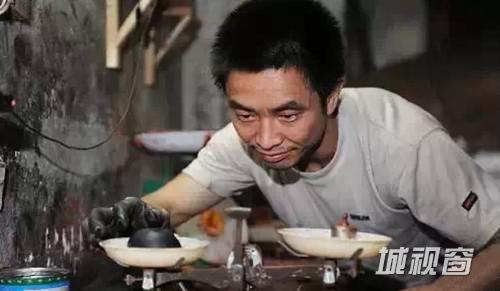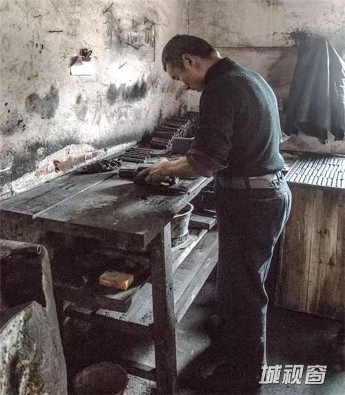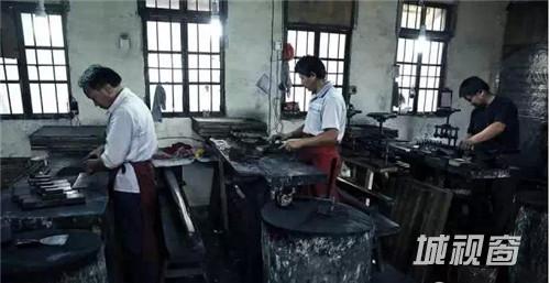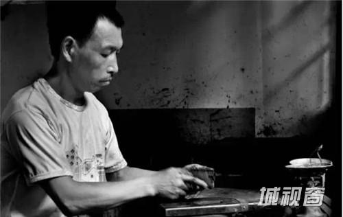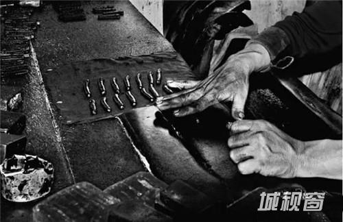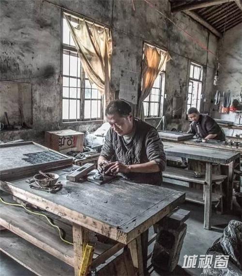 经过称重后,师傅们会将相同重量的墨锭充分揉搓捶打后,制成圆柱状,再放入墨模进行压制,墨模上的图案就会印在墨锭表面,挤压成型的墨锭待冷却完成后才能取出。这个环节一般不会有女工,因为是个非常耗体力的活,就算是师傅们也经常会满头大汗,还有的干脆打起了赤膊。