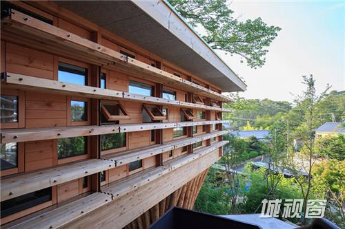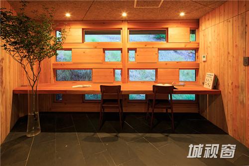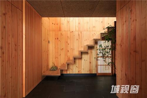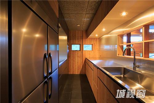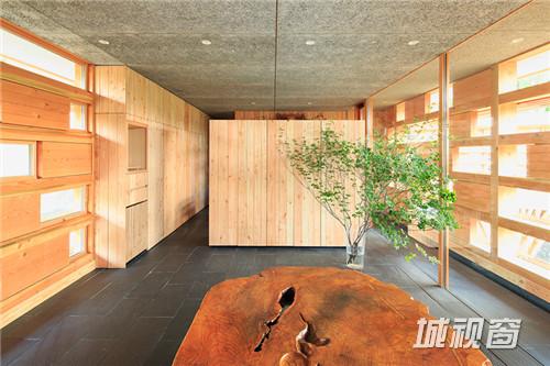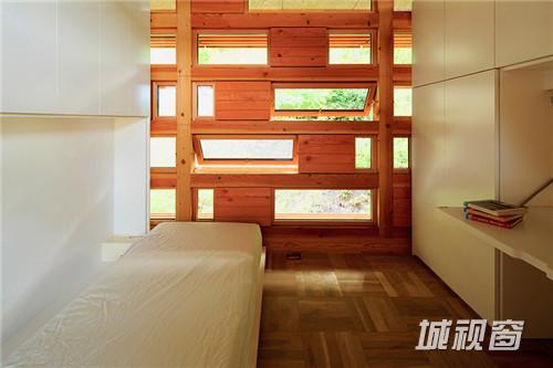 不仅仅是房屋的外部,其内部也由木材打造。左侧较大的翼房中包含起居室、厨房和餐厅,另一侧是卧室。整个设计中,房屋外立面的木材设有很多的方形孔,用玻璃装饰,这些方形玻璃窗能够为室内提供良好的周围视野和风景,同时又不会影响隐私。