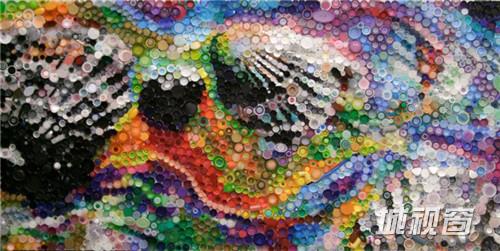 艺术家用数百塑料瓶盖制成精美壁画