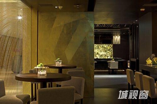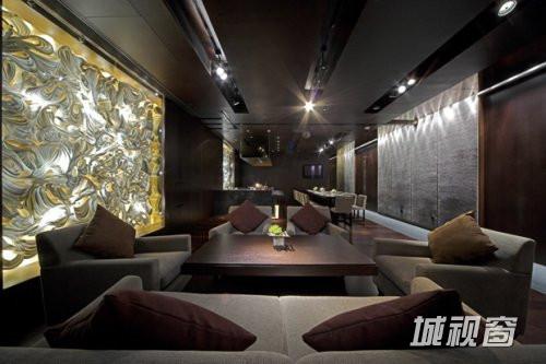 动线穿过长廊来到“稻菊” ,入口旁侧的落地玻璃墙镶饰着玛瑙石珠,透过珠粒串联的纹路望入空间,将视线引入室内的丽致场景。长廊沿路设置四间包厢可依使用人数弹性串连,包厢内设置吧台提供私人宴会更隐密且完善的需求。公共空间规划寿司,天妇罗及铁板烧吧台与客席。设计师希望能强调幽静氛围,在立面与天花板铺饰黑色镜面作为沉淀感官的元素,并透过若隐若现的倒影延伸出辽阔的空间感。紧临落地玻璃窗处的座区,运用带状的主导地坪烘托,将维多利亚海港的景致驻放在一座萤亮的舞台上,并经营厅区的场域层次。餐桌之间特地保留宽阔的距离,让宾客拥有余裕的空间感,舒适用餐。