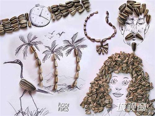 Victor Nunes利用生活用品设计各类3D艺术作品,艺术来源于生活,为了证明这一最基本的理念,视觉艺术家Victor Nunes 创造了一系列利用生活用品设计的各类3D 艺术作品。在Victor Nunes 手中,似乎有着化腐朽为神奇的魔力。 Victor Nunes 先是在白纸上绘画出风格迥异的素描画,在配合生活日常用品,如坚果、剪刀、衣夹、火柴、饼干甚至铅笔抛花,设计出各类惟妙惟肖的3D 艺术画作。创造这样的概念风格作品,看来需要画得一手好画,还要拥有天马行空得想像力。