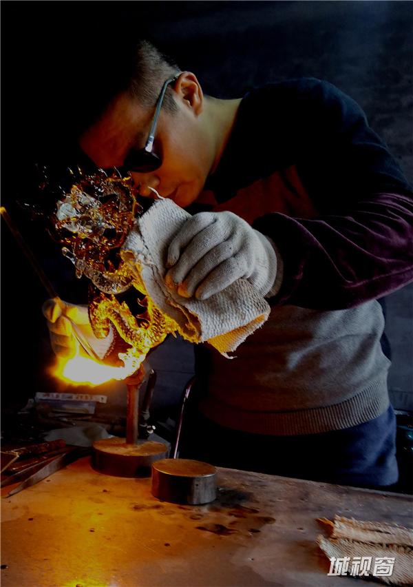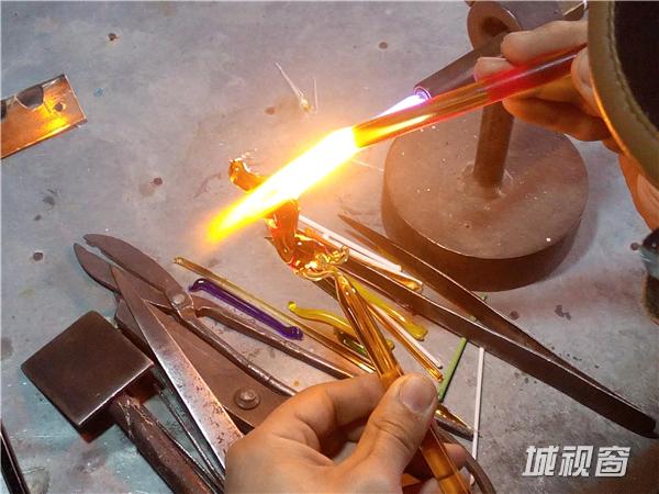 灯工工艺是利用玻璃棒或者玻璃管在高温焰口加热熔融,经过不同程度的软化后,利用拉、剪、钳、绕、粘、弯、吹等手法进行快速塑型。它是一种瞬间成型的艺术形式,在制作时可以随时调整手法与造型,甚至可以根据构思将玻璃棒进行反复、多次的熔合、拉伸、扭曲、缠绕等,工艺手法的组合运用可以瞬间产生无限的创新可能性。
