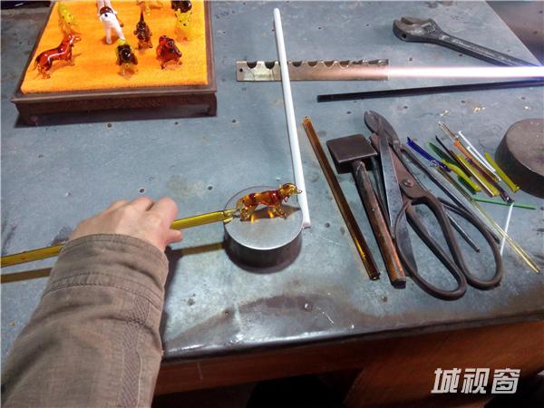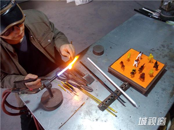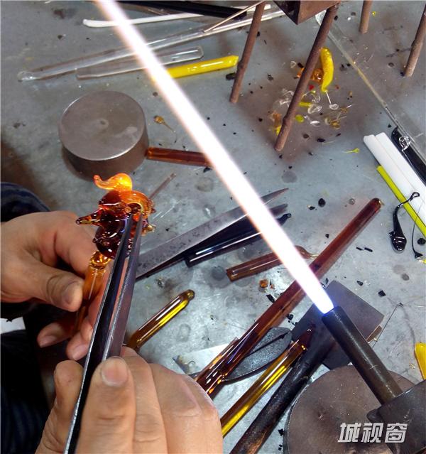 灯工不是一种仅凭机械或工具对玻璃外观直接加以改造的制作活动,它因为有“火”的参与,使得玻璃材料呈现瞬间多变的特质,可以细若蛛丝,也可以圆润如珠,形态万千。当玻璃棒或玻璃管在喷灯上加热后,制作者要随时调整手势来控制玻璃软化的速度,确定玻璃的软硬程度以便满足不同造型的要求,同时要借助各种小型工具加以雕琢,随时在“火”中调整玻璃形态。