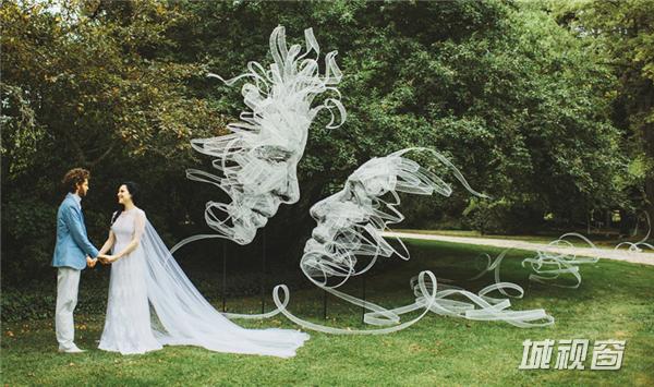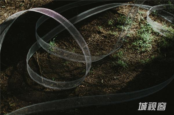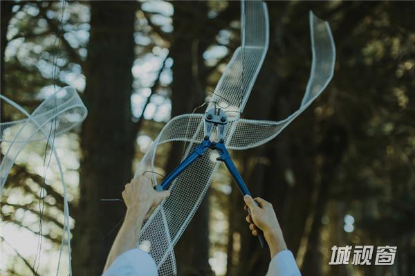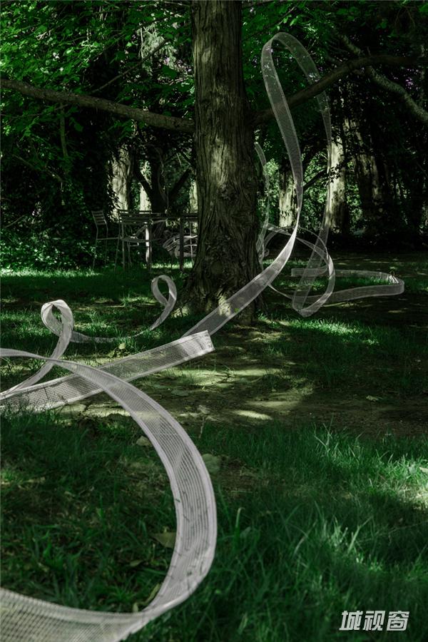 当客人一到婚礼现场,就会看见这件充满浪漫气息的作品,或者你不知道婚礼现场的具体位置,这件作品将你带到婚礼现场和宾客区。作品一共在森林里覆盖了150米远的距离。总共算起来,作品用到了超过4000米长的网带,艺术家完全通过手工将金属网带卷曲,并折叠边缘制造出绸带的效果,还用白色粉末将网带涂抹成白色。