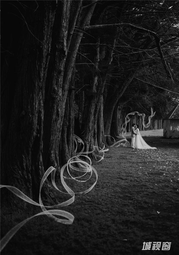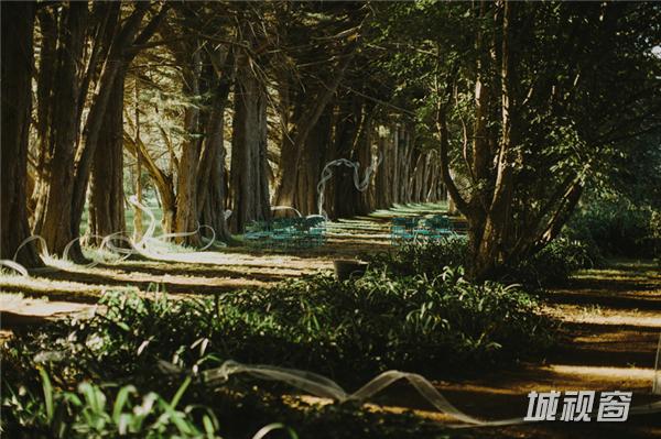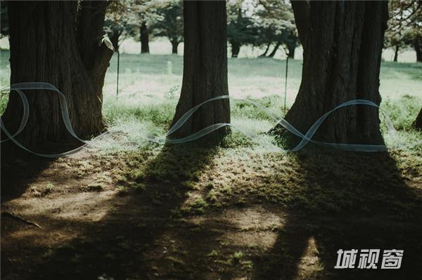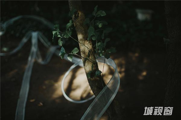绸带如清风一般飘过树丛,形成一个婚礼拱门的形状