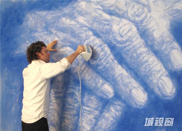 作品《时间的双手》的制作过程,用熨斗压实和折叠薄纱