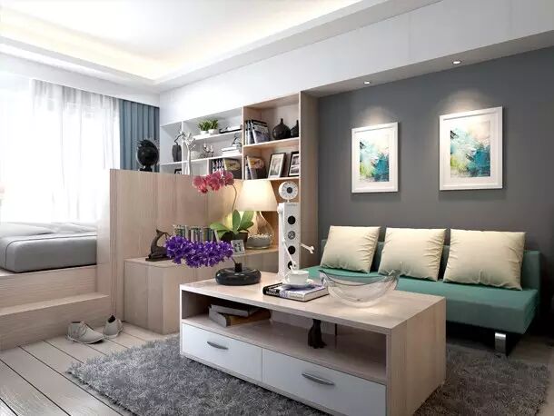 家居面积小,没有卧室的面积。将地台变身为床铺,再用隔板档起。一个温馨的小卧室就出现了!还为主人添加一张小桌子,用来摆放鲜花和台灯。