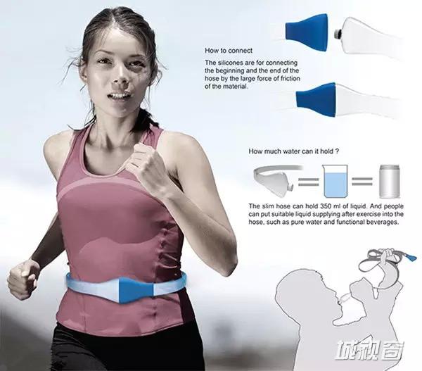 运动的时候最需要的就是能够及时补充水分,让燥热暂时被压住。但是,市面上的运动水壶往往不能够满足便携的要求,所以设计师 Yuan Peizhuo 和 Jin Huijian 便想出了非常有创意的腰带式水壶的点子。使用者不仅方便在跑步时携带还方便饮用,350毫升的水也足以满足普通运动爱好者的需求了。