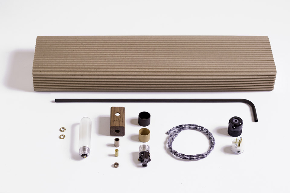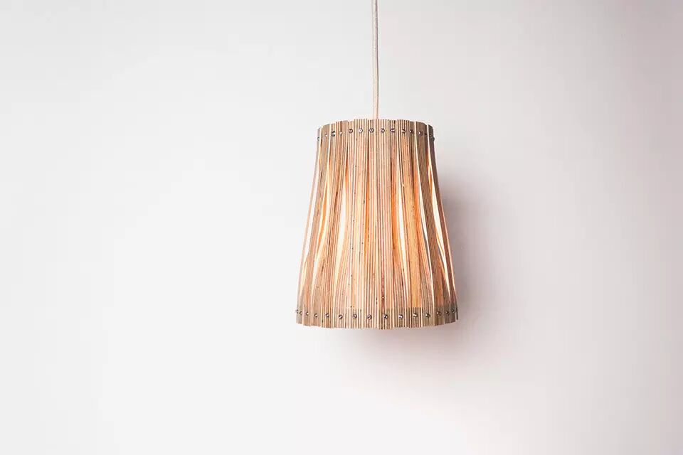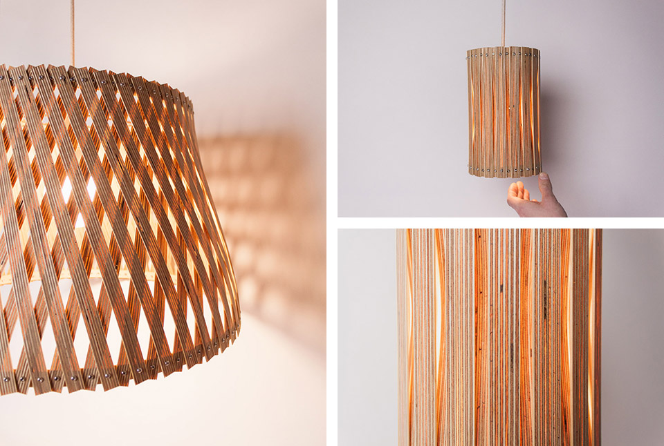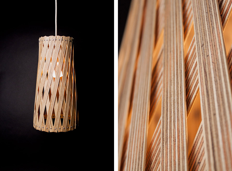 摆弄不同的部件使这些灯具最终成形。复合木是一种充当灯罩的有趣材料。桦木的第二层让光线透过材料穿透进来,因为薄片与木材的纹理结构相结合。这些灯具的一些部分在弯折成所需形状前被蒸过,以保持想要的形式。组合而成的不同部分提供了另一层—光影的运用。