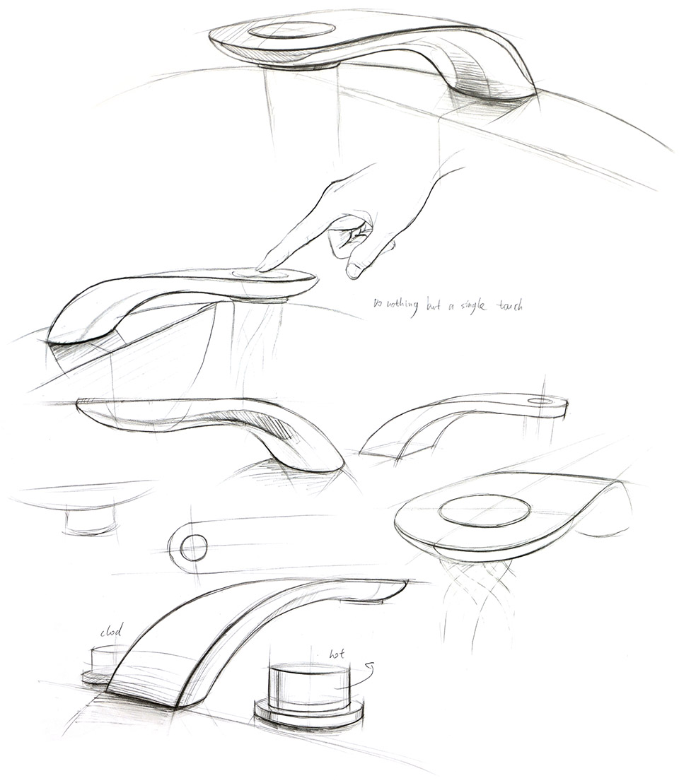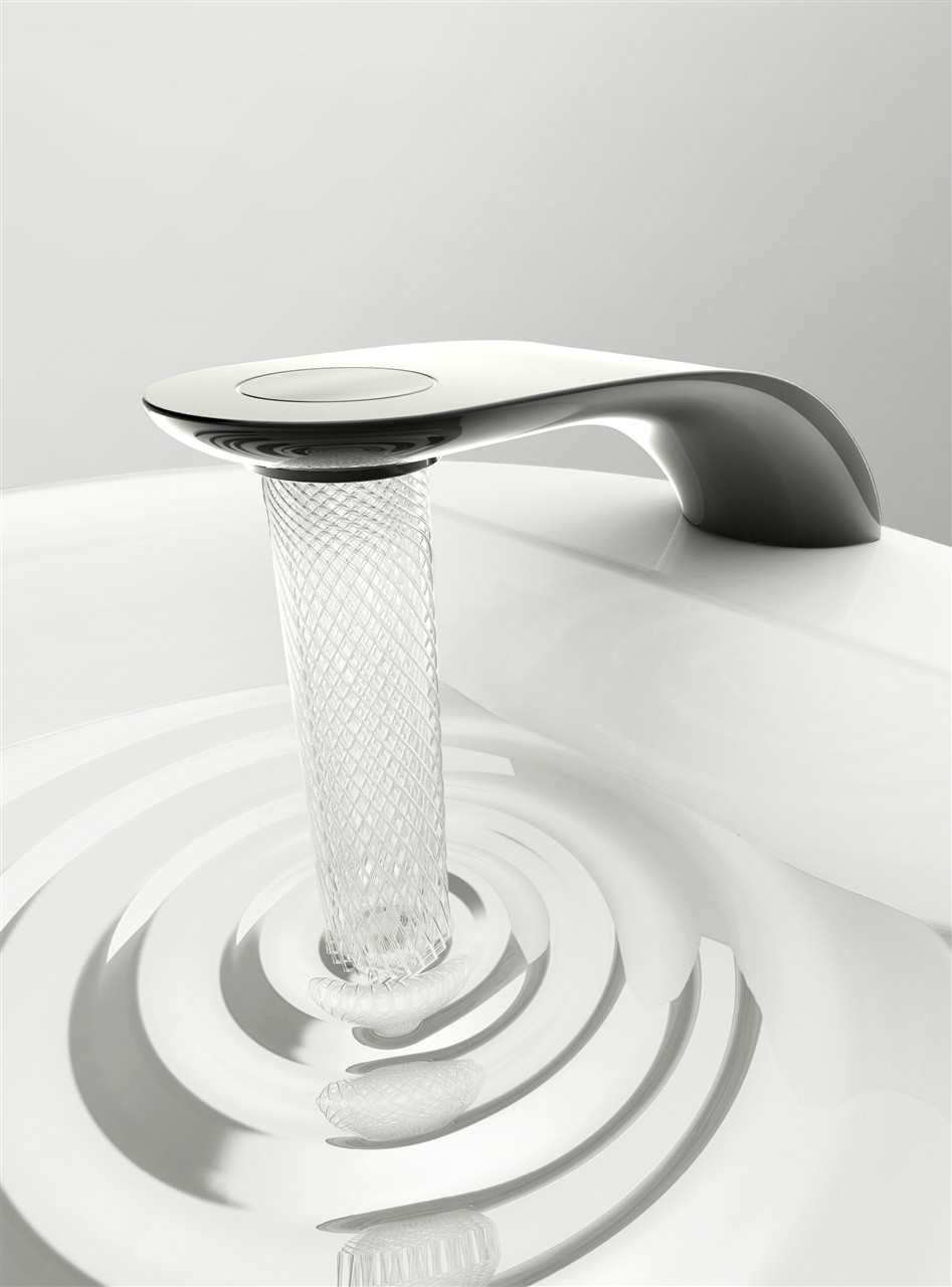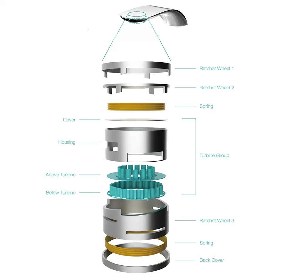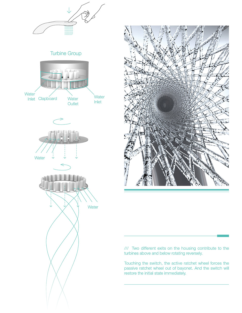 “温润”与“涡旋”水的理解,并将其表现于造型之上。左为按压式水阀爆炸图,右为涡旋出水原理图。水轮外罩上下错位开口实现两个水轮反向旋转。