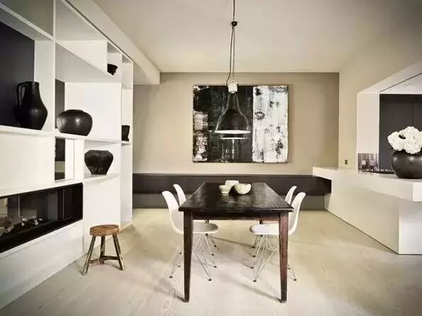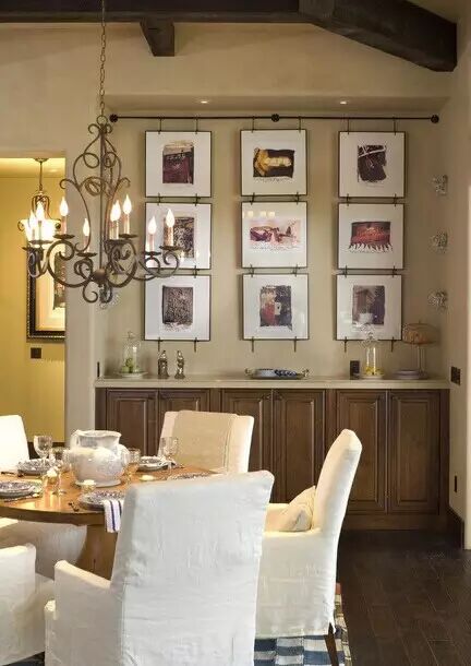 挂画方式:餐厅挂画,建议画的顶边高度在空间顶角线下60~2000px,并居餐桌中线为宜,而分餐制西式餐桌由于体量大,油画挂在餐厅周边壁面为佳。