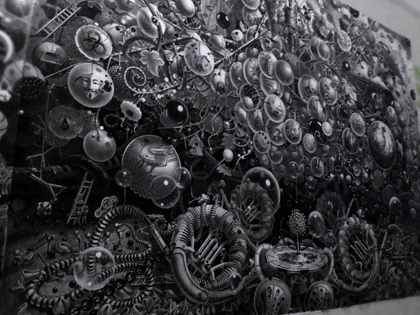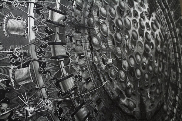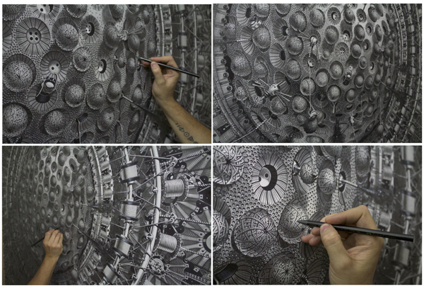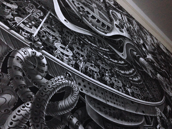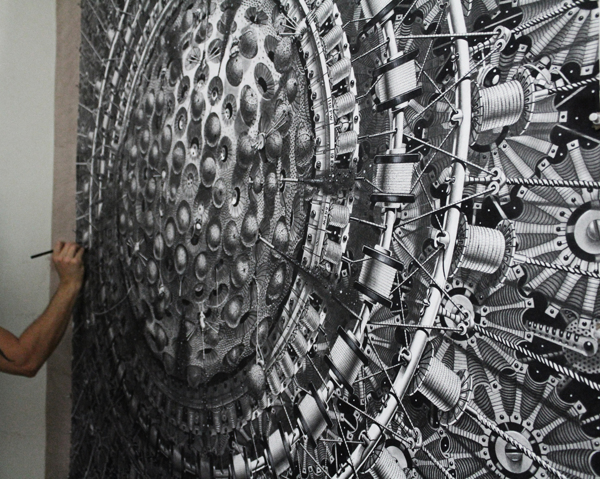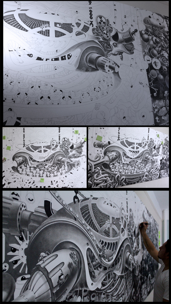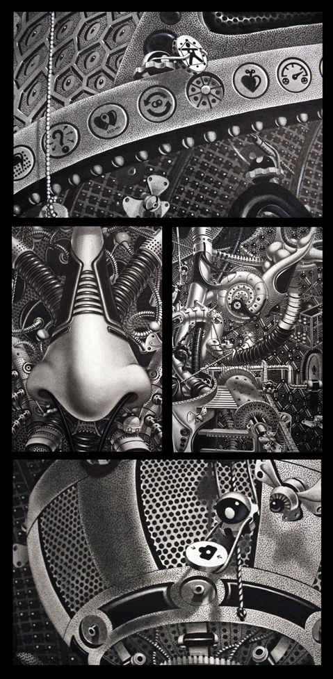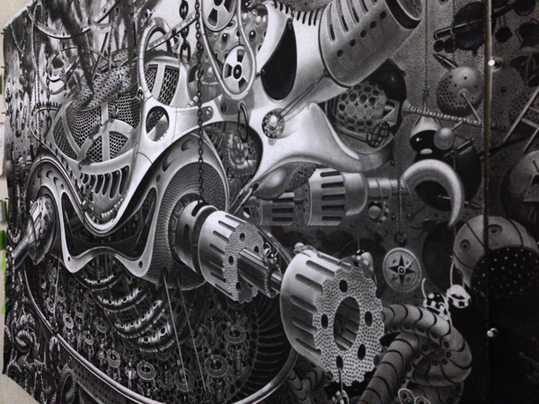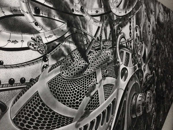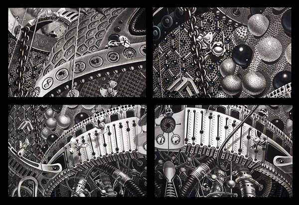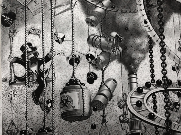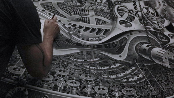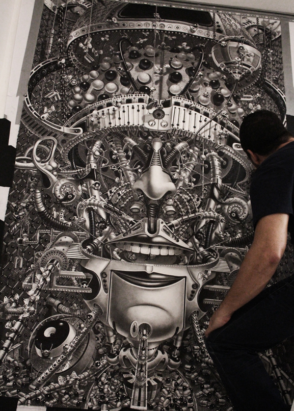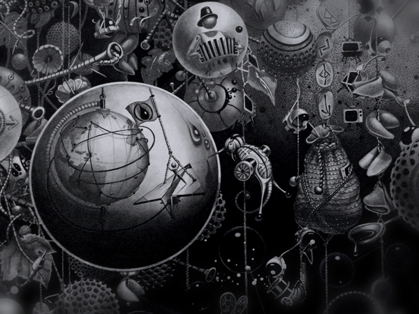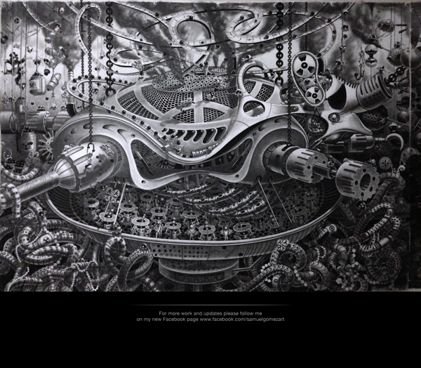来自纽约的艺术家Gomez,他的风格是一种超现实的蒸汽朋克,他将通用符号与科学等广泛的符号结合起来,Gomez的画面通过自己的叙事构成,高度阐述了机器般的纠结的世界,在作品中所有的事件和结果是紧密联系在一起的。