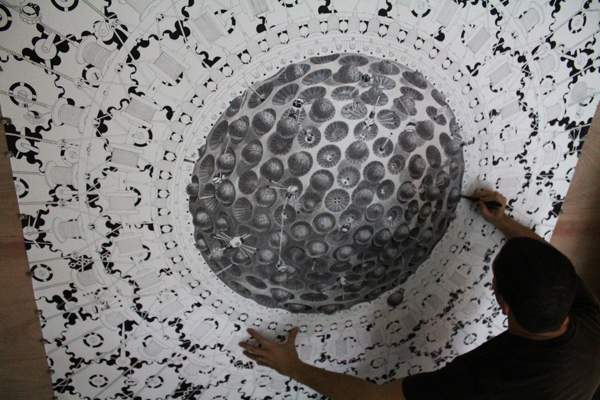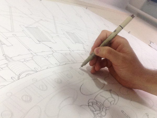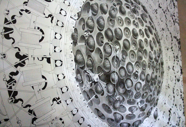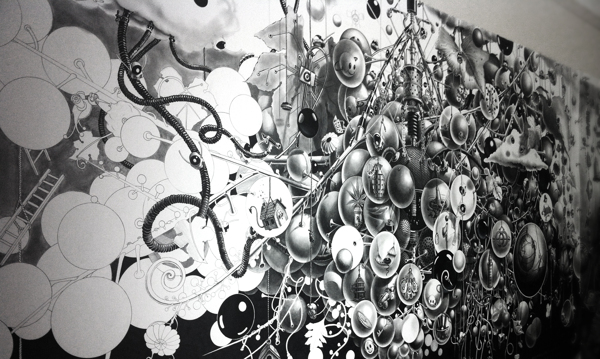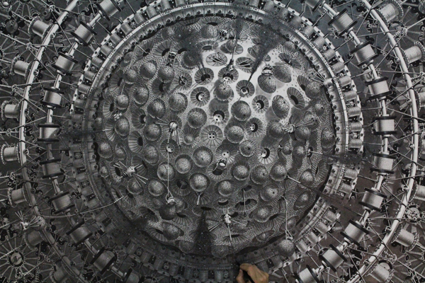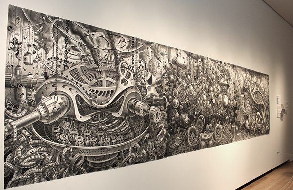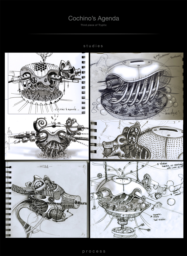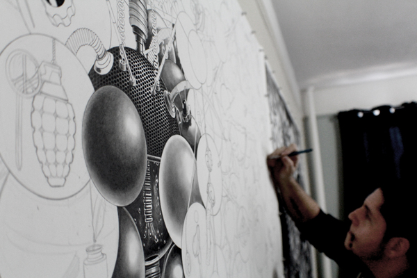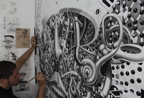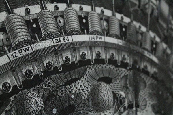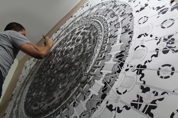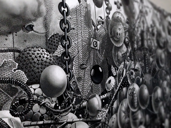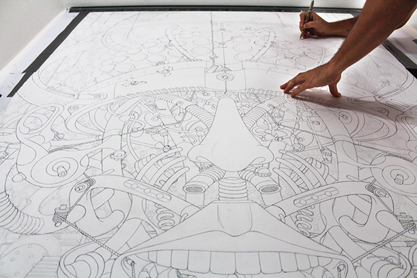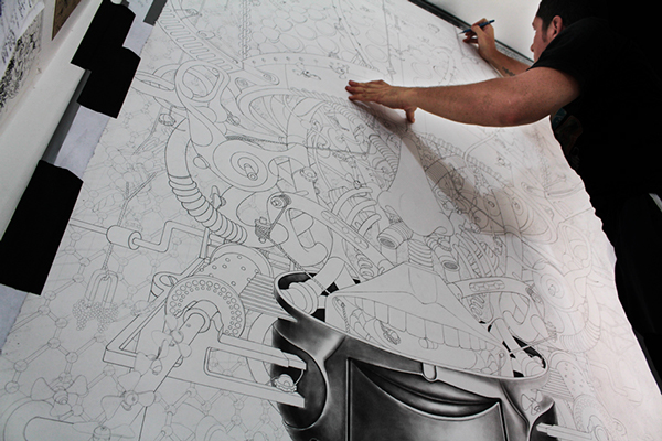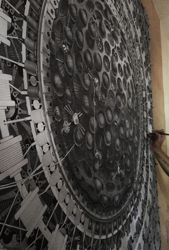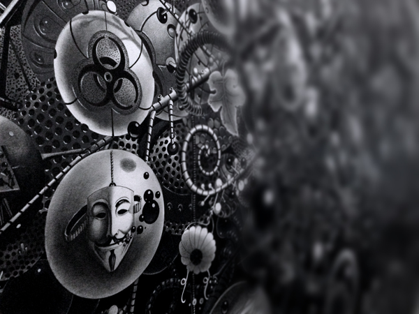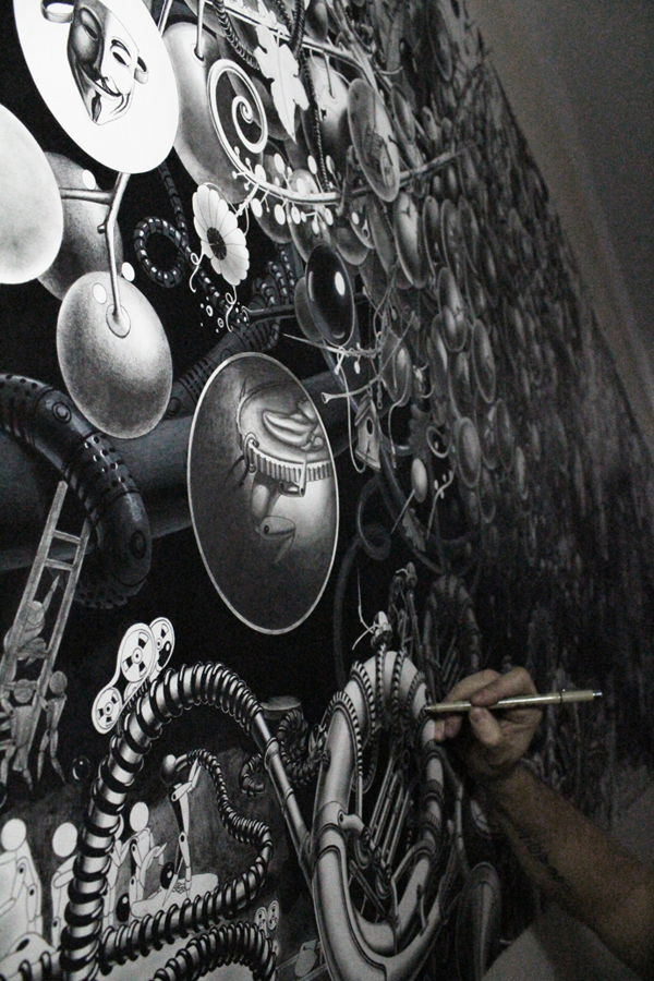来自纽约的艺术家Gomez,他的风格是一种超现实的蒸汽朋克,他将通用符号与科学等广泛的符号结合起来,Gomez的画面通过自己的叙事构成,高度阐述了机器般的纠结的世界,在作品中所有的事件和结果是紧密联系在一起的。