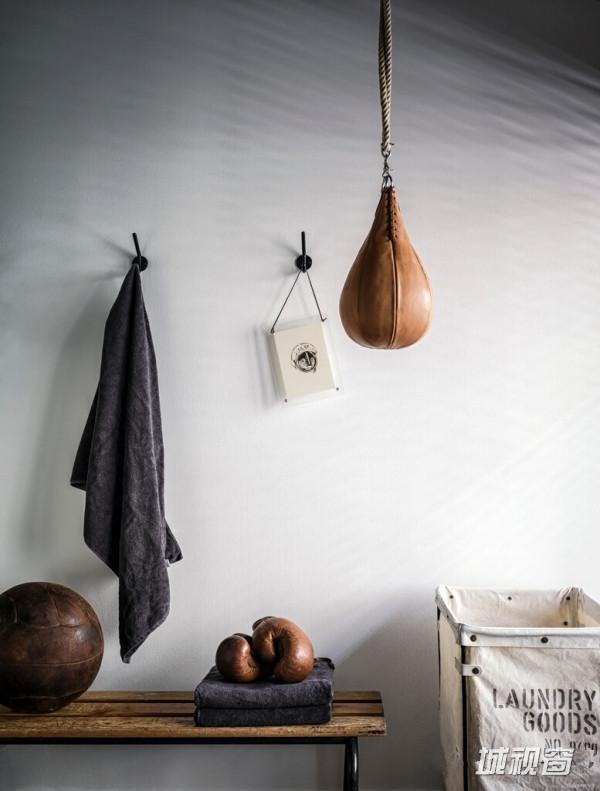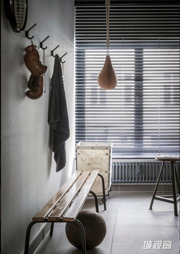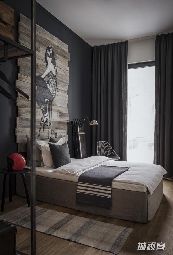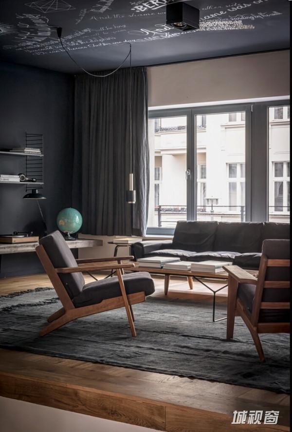 空间中加入木色地面,给深冷的总体环境增添温润的感觉,同时木质茶几和长型条桌都散发非常着温暖气息。简约的铁艺挂架、个性的吊灯和台灯,都极具工业风格的不羁风范。个性的CD机和贝斯、地球仪,很好地诠释了屋主的艺术家生活和气质。 客厅区域用木质地板略微抬高,层次分明更具空间感。单人沙发同样采用木质底架,温润的质感舒适自然,生活更有艺术性。屋顶上的白色涂鸦减轻了黑色屋顶造成的压抑感。