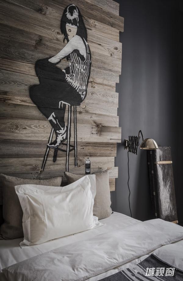 客厅区域用木质地板略微抬高,层次分明更具空间感。单人沙发同样采用木质底架,温润的质感舒适自然,生活更有艺术性。屋顶上的白色涂鸦减轻了黑色屋顶造成的压抑感。
