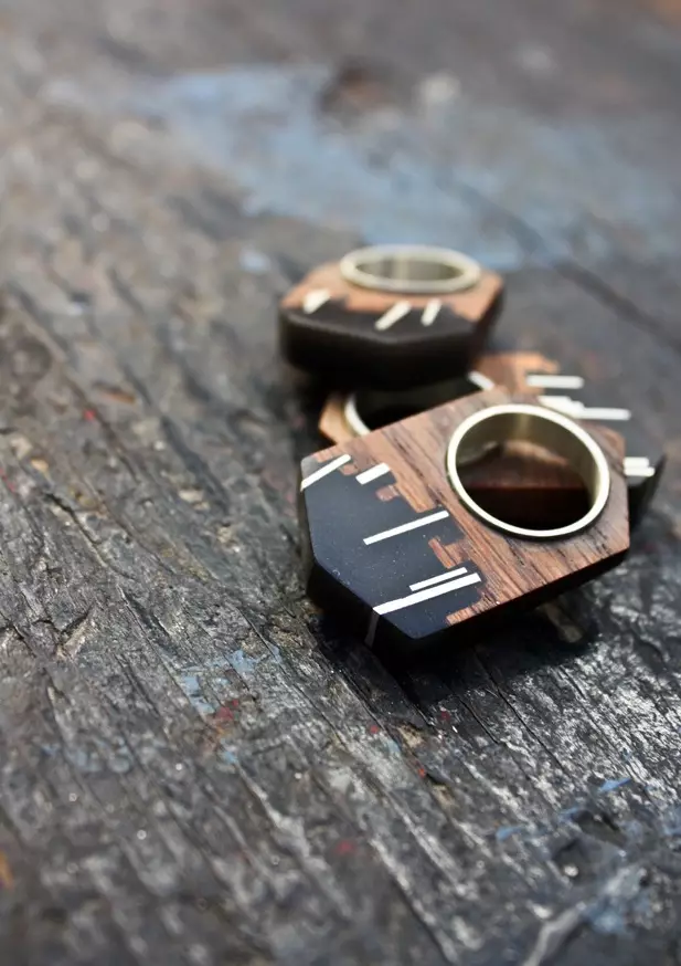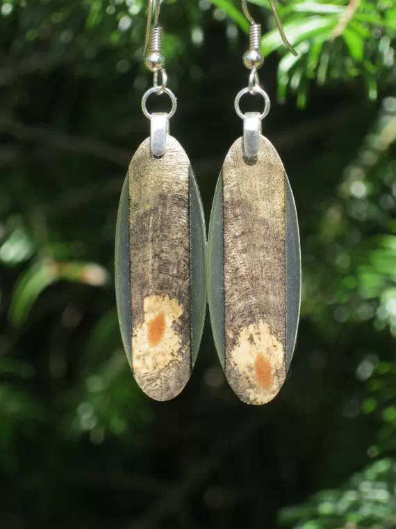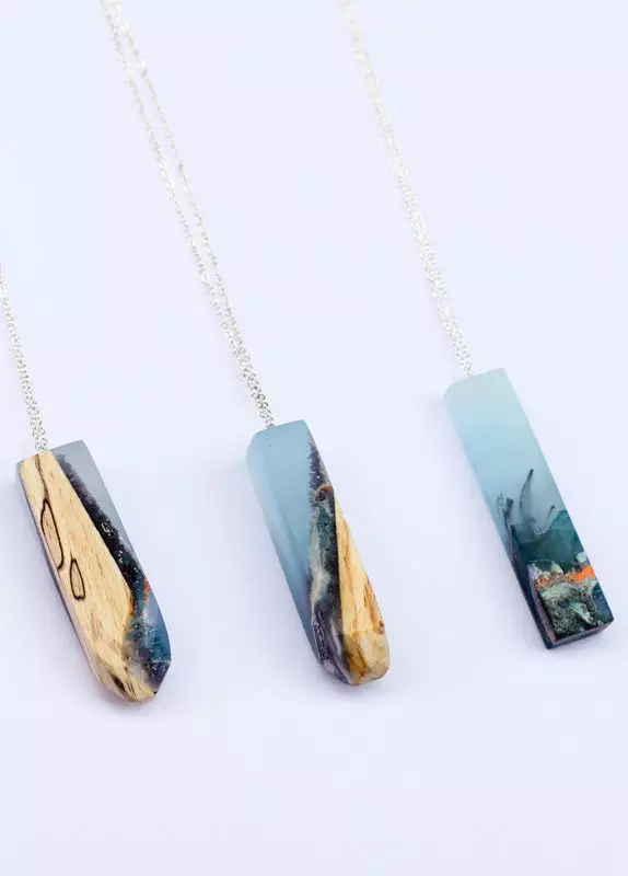 由枫木和有色生物树脂结合而成的独特首饰,每一面都呈现出不一样的图案,是环保而又富有特色的纯手工制品。