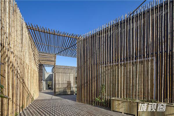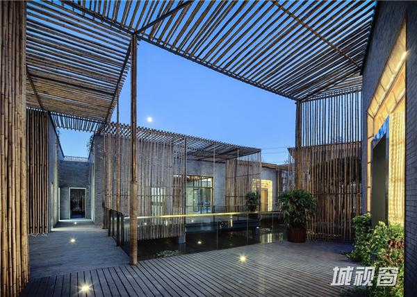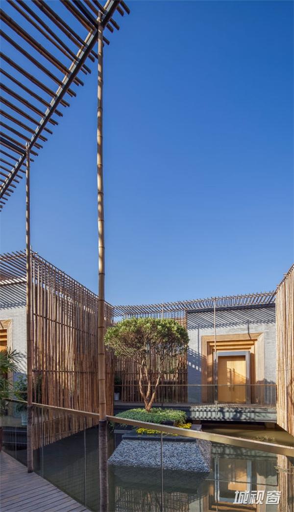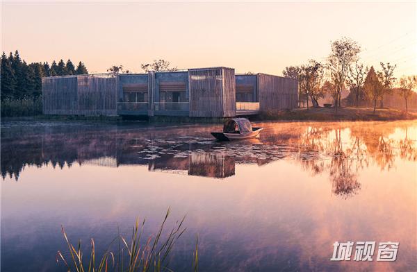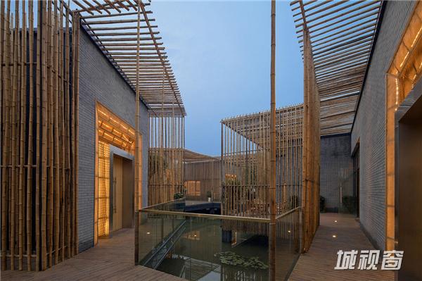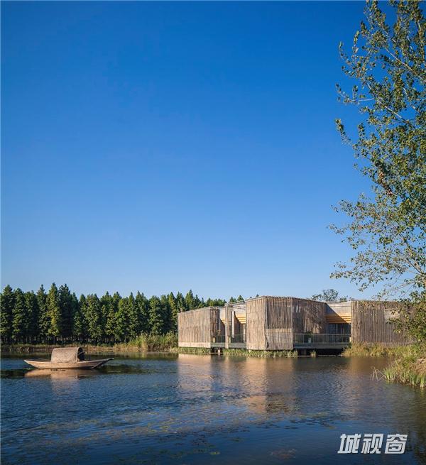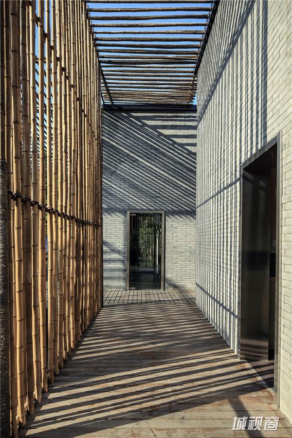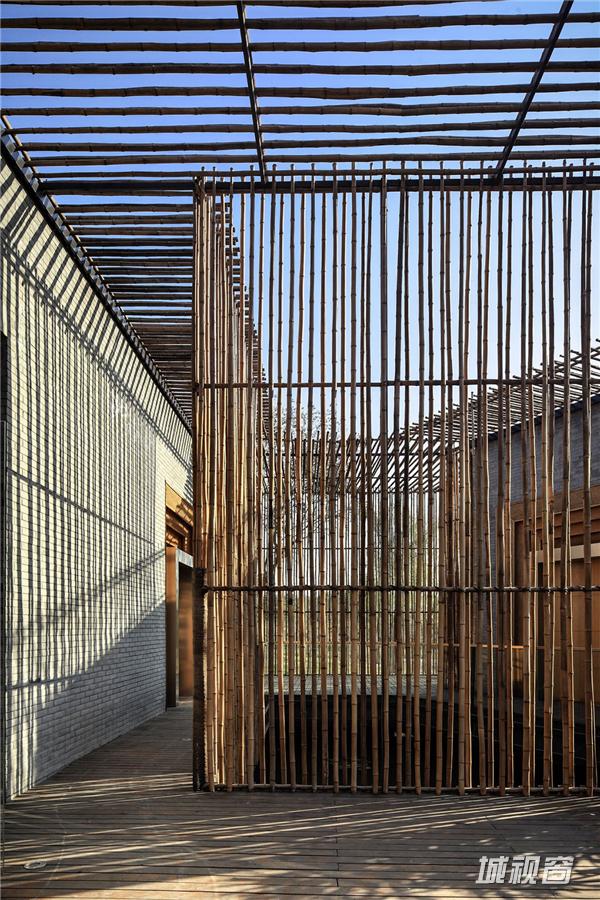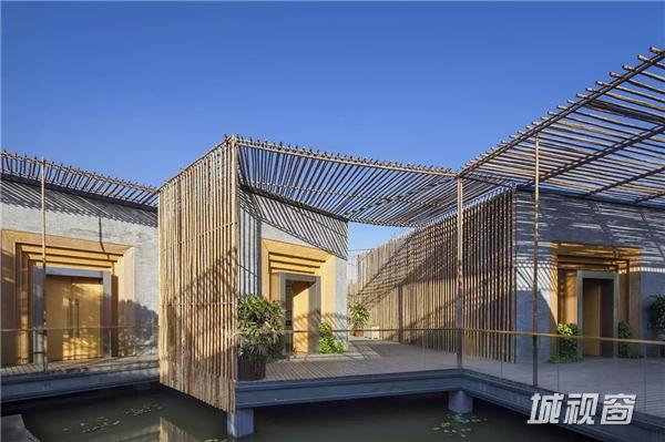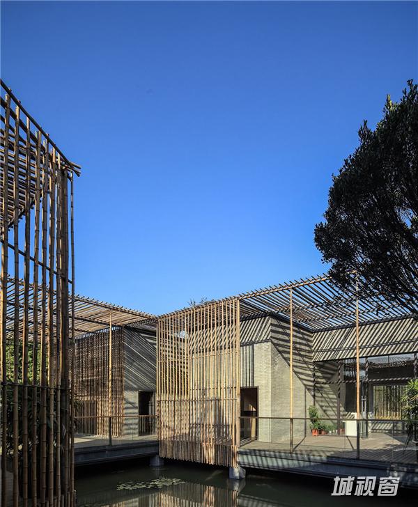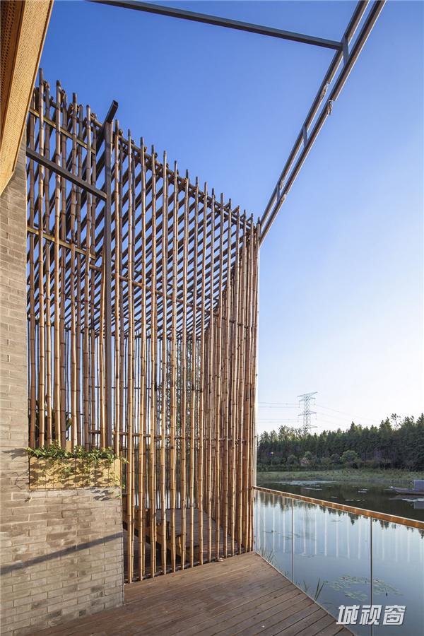 竹院茶屋位于扬州郊外的施桥园内,建于水上,茶室在格局上从扬州传统的庭园获得灵感,扬州庭园习惯由朝内的凉亭来营造一个内部观景空间,茶室的方形平面布局也是通过房间与中央平台的组合来构成,将一个个小空间分隔开来,营造出每一间茶室向内适宜静坐观赏的庭院风光、向外可纵览湖面全景的惬意区域。环绕庭院水池一周的步行道,是内部观景的主要部分,设计师将露天茶室与亲水平台散落地安置于这片区域,客人可以一边领略清韵野竹与茶香茶韵的相得益彰,一边在曲折蜿蜒的步行道上漫步赏景。