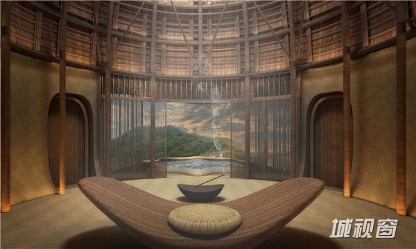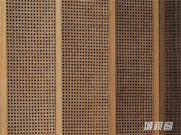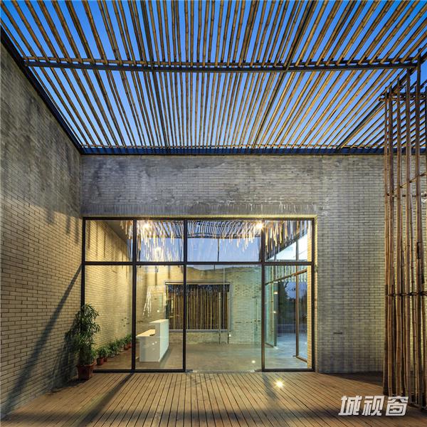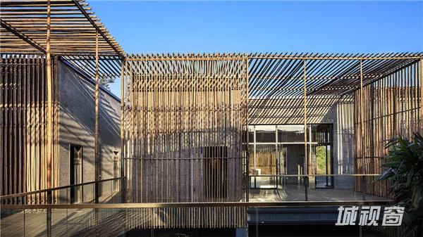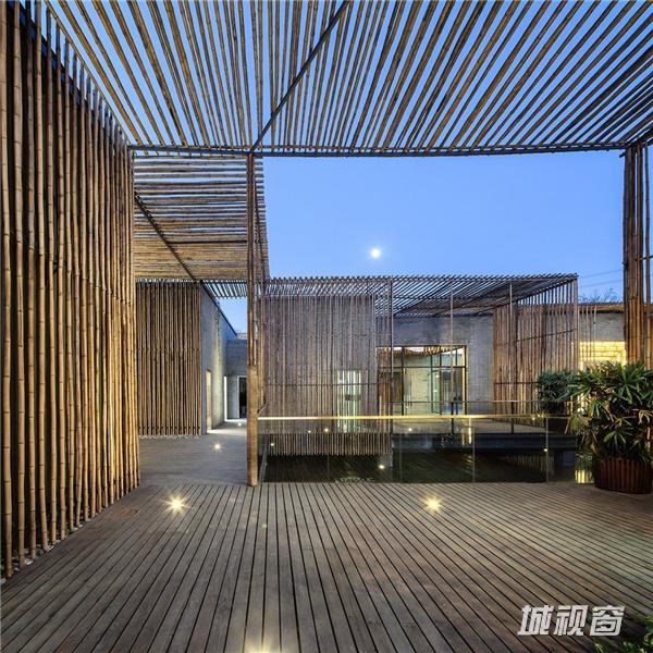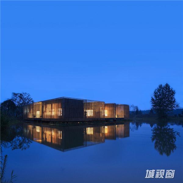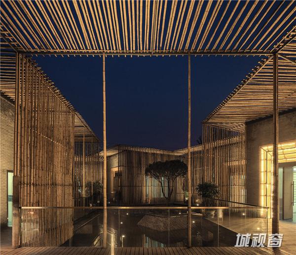 当夜晚灯火亮起,光线斑驳间,建筑本体的简洁线条更加明显,与自然紧密贴合。古人茶会,多于白天,很少秉烛夜游,设计师在这一点上更进一步,门灯与地灯的配置一应俱全,让竹院茶室的夜间景色也别具一格。其中茶室门的设计最为特别,在金属门框之外的一圈竹篾边框,制造出了灯光反射的效果,通过这种当地农村常用的手工艺品材料,设计师让夜晚的茶室也显得别有韵味。