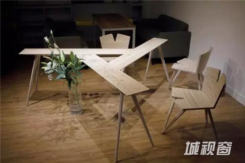 山水秀建筑事务所主持建筑师祝晓峰通过一组桌椅表达人、材、结构三者的关联。“三叉几”是互承式木结构,由三张无法独立的“半桌”,通过榫卯交互穿接而成。“V字椅”的椅座椅背都是分叉,表达对臀部和背部的支撑,椅腿仅三只,受力平衡由人脚和椅子合作完成。