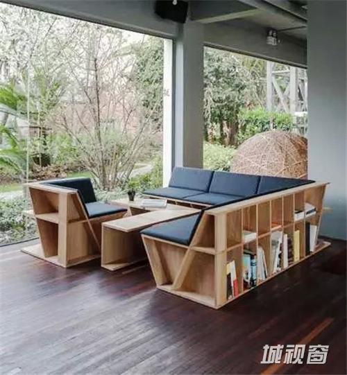 同济大学建筑系副主任章明与妻子张姿(同济大学建筑设计研究院(集团)有限公司原作设计工作室设计总监)设计了一组背书座,取自背书而坐,坐而背书。通过板材的横向、竖向、斜向相互插接,形成坐、卧兼具置物藏书功能的格构体,即可单独使用亦可根据需要任意组合。