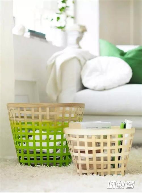 清爽渐变风 给沙发边增添几个竹编小筐,让收纳更加轻松随意,还可以用彩笔给小筐涂上色彩,清新的渐变效果最适合夏天。