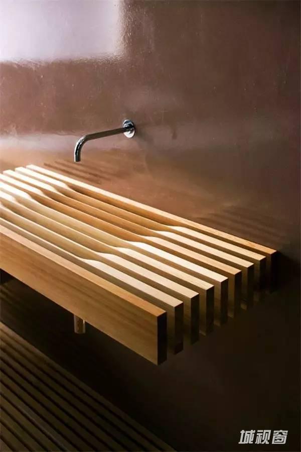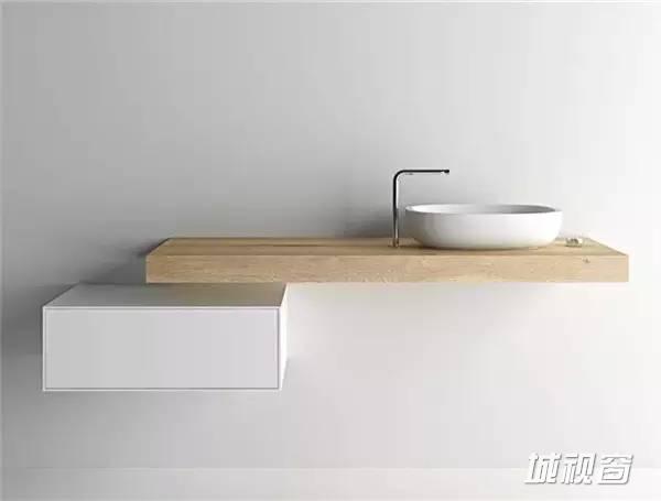 一款极简的洗手盆设计,白色和原木色的搭配很默契。