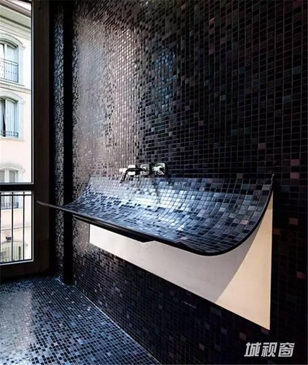 将墙壁的马赛克延续到了洗手盆,背后反衬托着一片白。