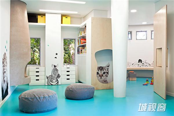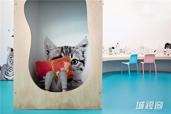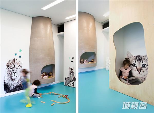 整个空间就好像在和动物共处或是做游戏一般,不是动物藏在洞穴中,就是小朋友们钻进去享受自己的小天地,和猫玩耍,和斑马逗趣。