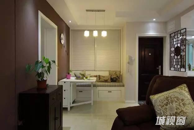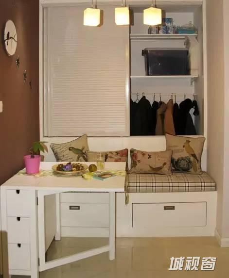 本来是一个很深的餐厅,但是考虑到目前只有两个人,吃饭大多在吧台,餐厅的面积有点浪费,因此把餐厅分为两部分,卡座后面是一个顶天立地的大橱,可以收纳衣物哦!