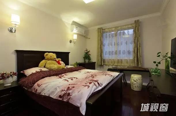 跟客厅一样墙面是白骆驼色,淡淡的暖意,配上深咖啡色的纯榆木家具,温馨中又带着质感。