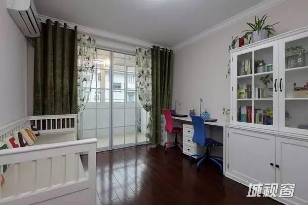 因为这个房间联通阳台,空间上本来就显得大,因此在进门处隔出来一个步入式衣帽间。正对门放一个坐卧两用床,另一面墙是双人书桌和书橱。