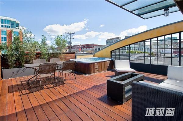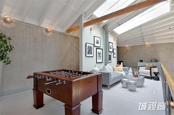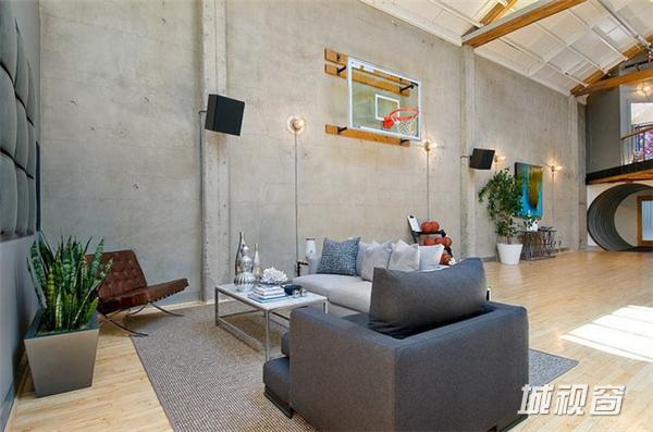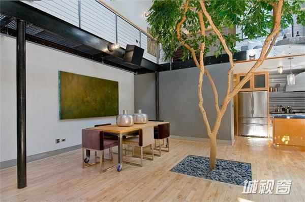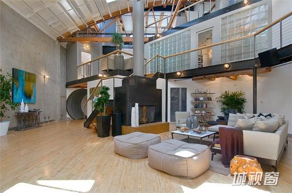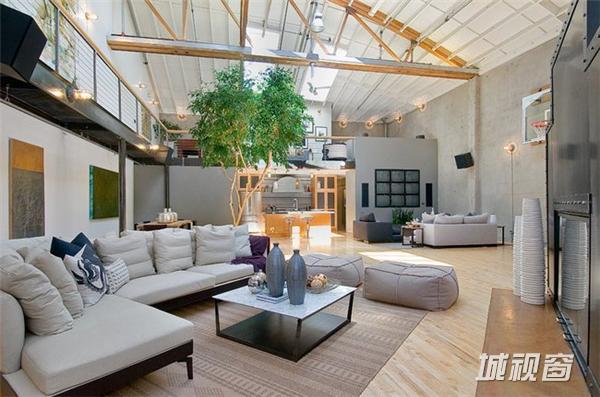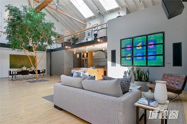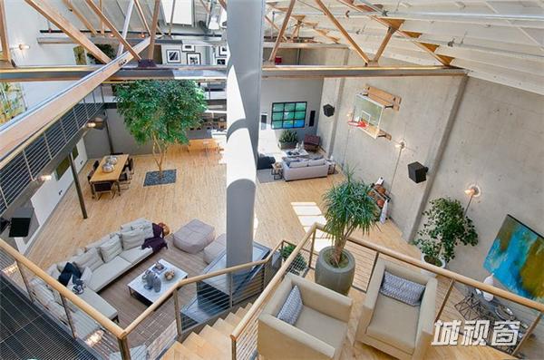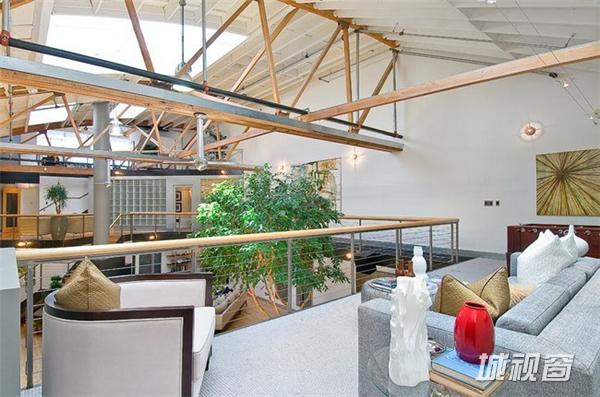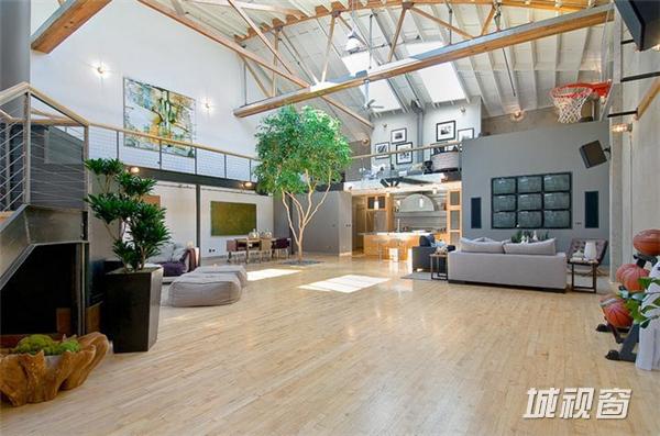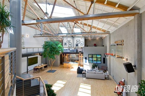 在旧金山市场街以南,这一408平米的宽阔空间原是个旧仓库,原业主在马丁建筑公司的协助下,将其改造成了集生活与娱乐于一体的家居空间。9米高天花板上的多个天窗被保留了下来,尤其一个可伸缩的中央天窗更为整个生活空间带来了明亮的自然光线。在敞亮的视野中,高挑的起居空间是一大亮点 ,其中包括了近6米高的一棵榕树 、迷你篮球场、工业风格的壁炉、厨房等。而周边的一些夹层则被辟为卧室、工作间等,屋顶还有带四个按摩浴缸的天台 。如此美妙的家居空间自然令人心生向往,但幸运的是你我不必再为此忧心,因为它已经被以332万美元的价格售出。