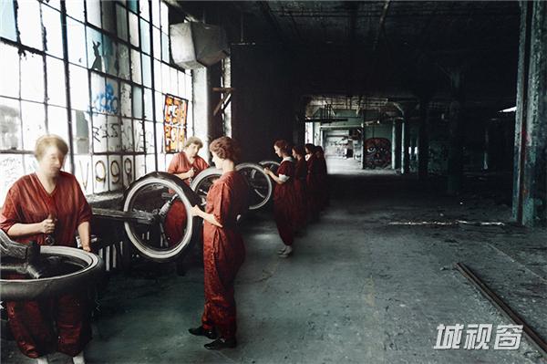 以前的工厂工人制作轮胎零件的照片被融合到了如今废弃的工厂里