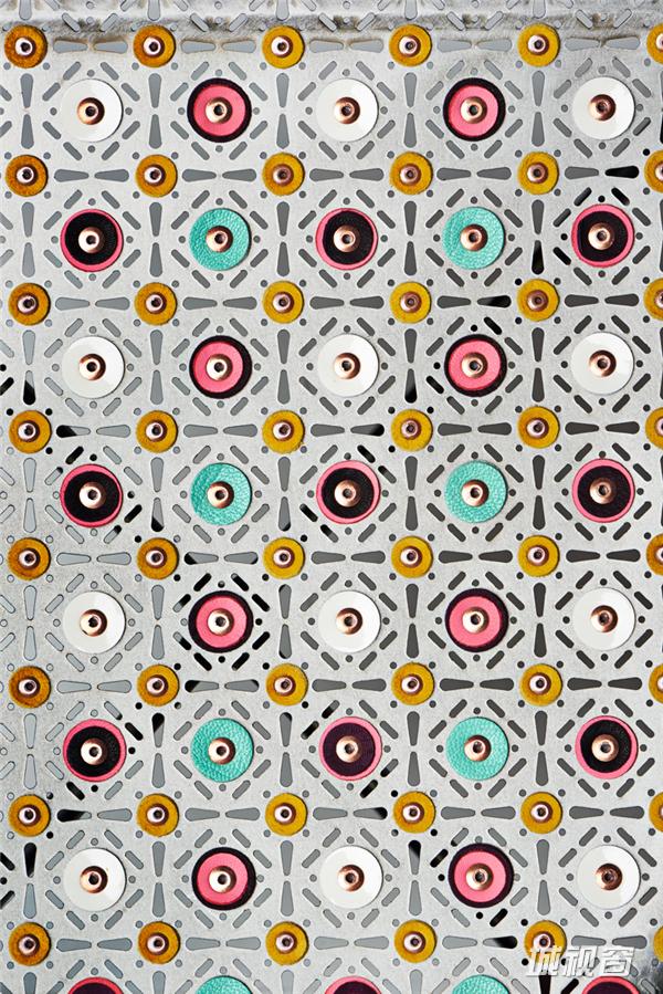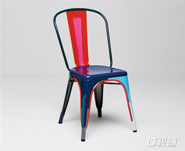 ↑julie richoz重新设计的座椅版本 “当我第一次见到‘chaise a’座椅时,我发现它的外形与装饰繁复表面涂漆的木质座椅相去甚远,但尽管如此,它还是立刻让我想起了我17岁时在跳蚤市场淘到的一把木质座椅。我十分喜欢这款座椅,因为它配色大胆,每个小细节和每个组成部分都用不同颜色界定。虽然‘chaise a’座椅让我想到的是另外的形态,但同时也让我意识到,我想到的这种特定的装饰方式一定可以与这款座椅结合起来。压纹金属板保证座椅强度、座面穿孔防止积水、清晰可见的多个焊接点等等,这些小细节都诉说着制作和装饰‘chaise a’座椅的整个过程,其中饱含着座椅自身的个性。我就是在这些充满个性的元素上手工涂上油漆。同时,座椅不是地毯一样的平面,而是一件立体的具有体量的物品,因此它的装饰过程将更具动态特征。也正因如此,我才有机会对这件作品进行波普艺术风格的个性化改造。由于这款座椅是为庆祝80周年而设计,我选择的颜色都十分鲜艳且具有节日气氛。”